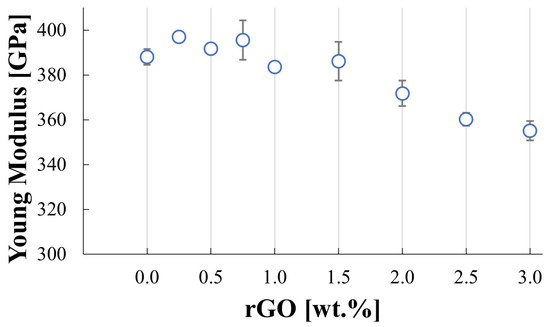 The measured Young’s modulus for the produced composites is presented in Figure 6. The highest value, 397 GPa, was observed for the SiC–0.25 wt.% rGO composite, which is slightly higher than the 388 GPa measured for the reference sample. A noticeable trend of decreasing Young’s modulus with increasing rGO content is observed. The lowest value, 355 GPa, was measured for the SiC–3 wt.% rGO composite.