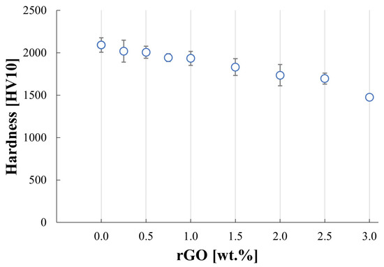 The addition of reduced graphene oxide to a silicon carbide matrix leads to a decrease in measured hardness. The results correlate well with the other researchers’ observations regarding the impact of graphene family fillers on composite hardness [15,16,17]. The enhancement of hardness may be obtained through the microstructure modification provided by the introduction of graphene-like phase but this often leads to the increased porosity, which can weaken this enhancing effect. The microstructure refinement effect on the hardness of the composites can also be countered by the presence of agglomerates. In the produced composites, it was observed that the higher the rGO content is, the lower the hardness becomes.