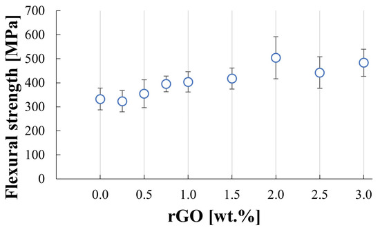 An increase in rGO content in the SiC matrix leads to an increase in the flexural strength of the produced composites. The flexural strength values for up to 0.5 wt.% rGO content are very similar to each other. The rise can be observed afterward and shows an influence of the addition of the reinforcing phase. The beams were cut in a way that rGO particles are aligned perpendicular to the direction of the load in the bending test. This allows the rGO flakes to have the optimal orientation and, in consequence, the highest impact on the flexural strength of the composites. A slight drop in measured values can be observed for the SiC–2.5% wt. rGO and SiC–3% wt. rGO, which is correlated with the lower density for these two sinters.