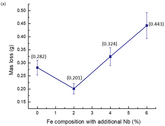 (a) Mass loss and (b) corrosion rate of Fe-C and Fe-C-Nb with different percentages of Nb addition.
