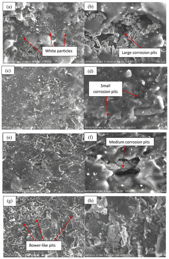 In the case of Fe-C-Nb with a 4% niobium addition, the corroded samples were enveloped by white impurities, indicative of acid sediments. Acid sediment refers to solid residues or byproducts formed during the corrosive process involving naphthenic acid. Additionally, medium-size corrosion pits were observed beneath the dispersed acid residues. However, the corrosion pits in this sample did not exhibit a severe corrosion attack compared to the base metal Fe-C. This observation may be attributed to the presence of a thick layer of acid sediment covering the surface [32]. This observation aligns with the findings of Yunzu Xu et al., where the steel exhibited numerous scattered small pits. Furthermore, the entire steel surface exhibited roughness following the pure corrosion process [33].