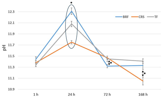 pH evolution with time (1, 24, 72 and 168 h) of distilled water at 37 °C in contact with BRF (BioRoot™ Flow), CRS (CeraSeal) and TF (TotalFill®). * p < 0.05.