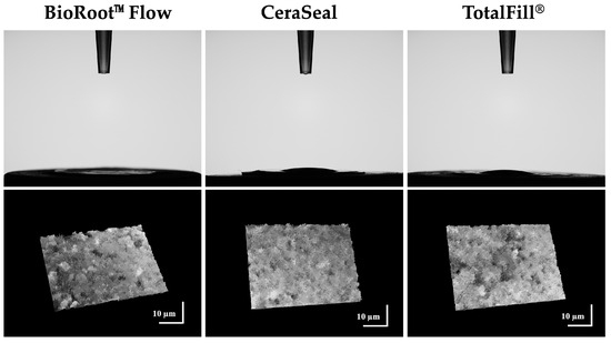Water drop profiles on BRF (BioRoot™ Flow), CRS (CeraSeal) and TF (TotalFill®) surfaces after 10 s of water drop deposition. Digital micrographs of the different surfaces using KEYENCE 7000 VHX showing the roughness of each material.