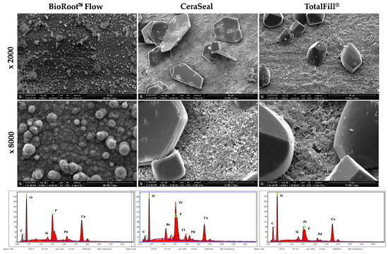 Scanning electron microscope images (2000× and 8000× magnification) demonstrating the mineral depositions on BRF (BioRoot™ Flow), CRS (CeraSeal) and TF (TotalFill®) surfaces after 7 days of immersion in PBS. EDX analysis demonstrates the chemical compositions of the different surfaces.