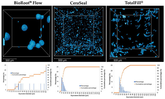 Volume rendering of segmented pores (blue color) with a scale bar of 500 µm, and equivalent pore diameter–frequency curves obtained by X-ray tomography analysis in BRF (BioRoot™ Flow), CRS (CeraSeal) and TF (TotalFill®).
