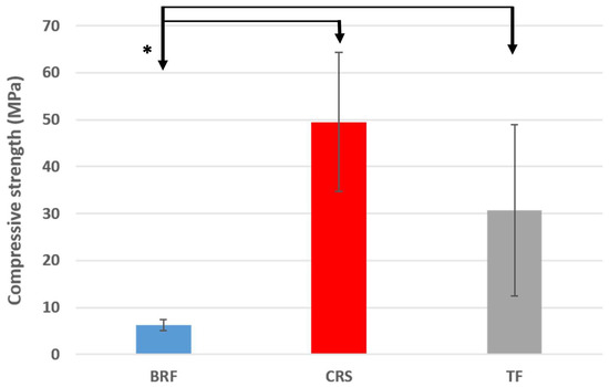 A lower significant compressive strength value was found for BRF (6.16 ± 1.13 MPa) compared to CRS (49.49 ± 13.26 MPa) and TF (30.71 ± 18.28 MPa) (p < 0.05). No significant difference was found between TF and CRS (p > 0.05) (Figure 6).