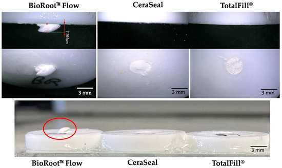 Digital images of the material expansion of BRF (BioRoot™ Flow), CRS (CeraSeal) and TF (TotalFill®) after 72 h of incubation at 37 °C. Red circle showed the expansion of BRF sealer.
