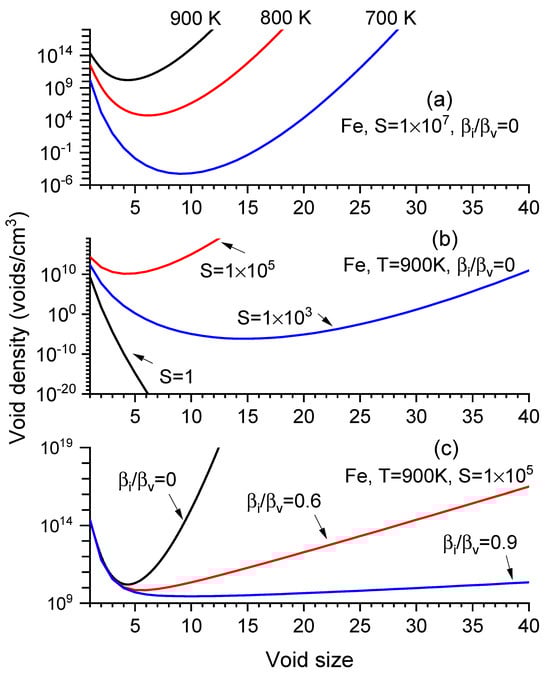 As a summary of the results obtained using Equations (4) and (5), Figure 1a–c shows distribution changes by varying temperatures ), vacancy supersaturation ratios , and the ratios of interstitial-to-vacancy arrival rates to a void (). All curves feature a dip at the critical size, . With increasing , the size curves move upwards, exhibiting smaller and higher (Figure 1a). Similarly, with increasing S values, the curves shift upward, reducing and increasing (Figure 1b). Increasing increases while reducing void density at large sizes (Figure 1c).