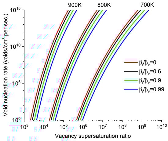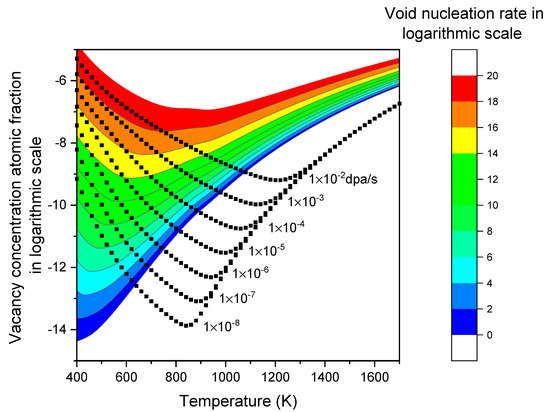 The color bands in Figure 3 represent the contour map of the void nucleation rate as a function of vacancy concentration and temperature. Each color or contour line corresponds to a constant void nucleation rate. It exhibits a V-shaped pattern. For lower void nucleation rates, the minimum point of the V-shaped pattern shifts to lower defect concentrations and temperatures. The V-shaped behavior primarily arises from the change in the critical void size (). When is larger, the void density at that size, , is lower, resulting in lower void nucleation rates. In the high-temperature region (i.e., >900 K), decreases with increasing temperature, leading to higher nucleation rates at higher temperatures. The effect of irradiation is less significant in this temperature range because is already high, and the irradiation-induced S changes become insignificant. At extremely high temperatures, S approaches 1. In the low-temperature region (i.e., T < 600 K), the effect of S becomes more significant as is very low. Although lowering the temperature would tend to increase , the high value of S counteracts this and reduces . The significant changes in S alter the trend, resulting in the V-shaped temperature dependence as shown in Figure 3.