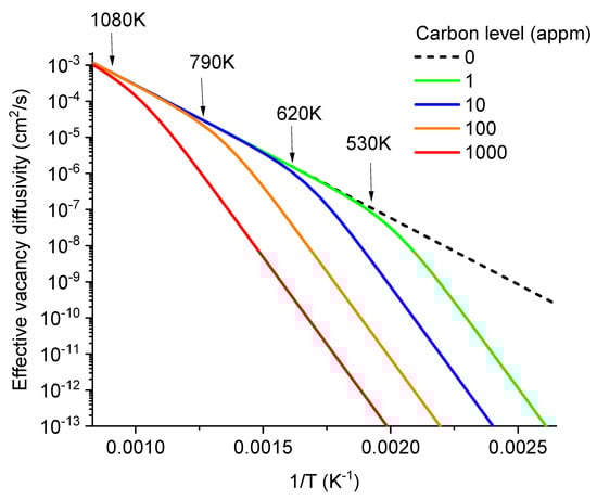 The method of calculating effective vacancy diffusivity in the present study follows the early approach of Fu et al. [17]. The diffusivity calculation in Reference [17] used a vacancy migration energy of 0.67 eV. In the plot of Figure 4, an activation energy of 0.73 eV is used [27], to be consistent with the calculations in the preceding sections.