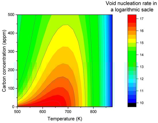 Substituting into rate theory calculations to determine and , and then substituting these parameter values into the void nucleation rate calculation, one obtains J as a function of both carbon concentration and temperatures. As shown in Figure 5, introducing carbon dramatically changes the contour map. At zero carbon concentration, the nucleation rate remains high at temperature below ~700 K. However, with a small amount of carbon addition, nucleation rates quickly evolve into a temperature-dependent peak. As the carbon concentration increases, the peak height becomes lower, the peak width is narrower, and the peak center slightly shifts to a higher temperature.