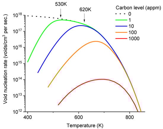 In Figure 6, the void nucleation rates are plotted as a function of temperature while fixing carbon concentrations at distinct levels of 0, 1, 10, 100, and 1000 appm. At zero carbon concentration (dot line), J remains above 3 × 1017/cm3 per second when temperature is at 600 K and below. Even with carbon levels as low as 1 appm, void nucleation begins to show a peak. The nucleation rates start to drop at temperatures ~530 K and below. At a higher carbon level of 10 appm, the nucleation allowable temperature window is narrower, and the temperature of the maximum void nucleation rate increases to about 600 K. Additionally, at this carbon level, the peak nucleation rate is noticeably lower than in the carbon-free case. As shown by two arrows (one at 530 K for 1 appm carbon and the other at 620 K for 10 appm carbon), the temperatures at which void nucleation begins to deviate from the carbon-free case correspond to the temperatures at which effective diffusivities of vacancies begin to deviate from the carbon-free case (as marked in Figure 4). At a higher carbon level of 100 appm, the peak shifts to about 670 K, and the peak height is about 25% of that in the carbon-free case at the same temperature. At the highest carbon level of 1000 appm, the nucleation peak is reduced by more than two orders of magnitude compared to the carbon-free curve at the same temperature.