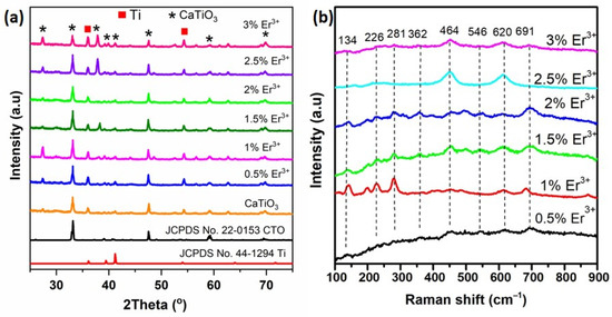 (a) XRD patterns of CaTiO3: xEr3+ films (x = 0.5, 1.0, 1.5, 2.0, 2.5, and 3.0 mol%); (b) Raman spectra of CaTiO3: Er3+ films.