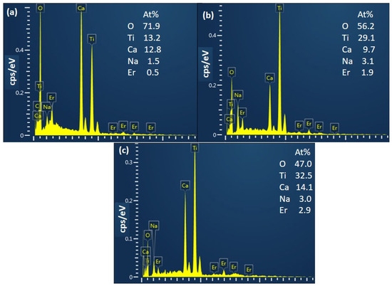 EDS spectra of (a) CaTiO3: 0.5%Er3+, (b) CaTiO3: 2%Er3+, and (c) CaTiO3: 3%Er3+ samples.