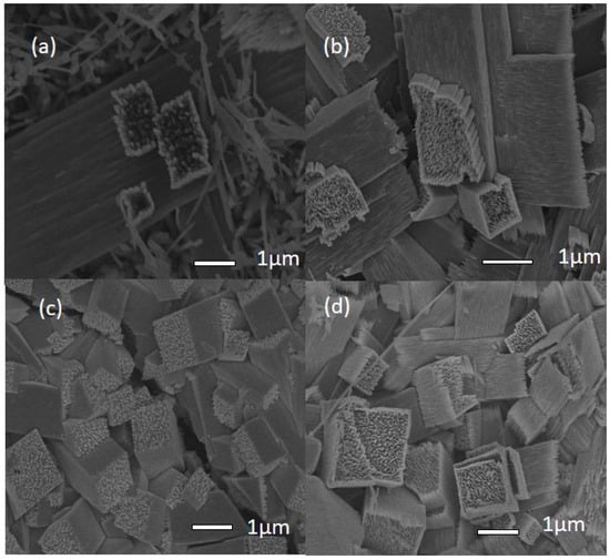 Figure 3 shows the FESEM picture of the CaTiO3: Er3+ films. As shown in Figure 3, when the CaTiO3 is doped at a concentration of 0.5% Er3+, the material begins to form fiber clumps. Increasing the doping concentration of (1–2)% Er3+ leads to the formation of increasingly homogeneous square-shaped fiber bundles. The CaTiO3: Er3+ films consist of uniform cubic particles with a bar length of ~(1–5) μm and a width of ~(1–2) μm. The results of this SEM analysis are consistent with the previously analyzed XRD data.
