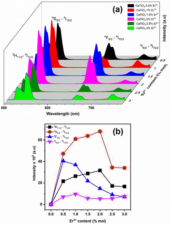Following the successful fabrication of the material, we proceeded to investigate its optical properties when doped with rare earth erbium (Er3+) ions. Samples doped with Er3+ at varying concentrations, ranging from 0.5% to 3%, were employed to investigate their optical properties. Figure 4a,b depict the UC luminescence spectra for all samples with an excitation wavelength of 980 nm. Upon 980 nm excitation, all samples show intense green UC emission bands at 523/550 nm (2H11/2→4I15/2/4S3/2→4I15/2), a faint red emission band at 650/680 nm (4F9/2→4I15/2), and a far-red band at 740 nm (4I9/2→4I15/2). Across all samples with different Er3+ doping concentrations, a robust green emission band and a diminishing red emission band are consistently observed. The dominant emissions are located in the green luminescence range for CaTiO3: Er3+ films. The comparative intensity of the three energy level transitions 4F9/2→4I15/2, 2H11/2→4I15/2, and 4S3/2→4I15/2 increases with increasing Er3+ concentration. The peak up-conversion (UC) emission intensity for the CaTiO3: Er3+ films was identified by upholding the optimal convergence of the Er3+ activator. The discernible red and blue emission peaks suggest enhanced conversion of infrared light to visible light, attributed to the synergistic effect of Er3+ ion co-doping in CaTiO3. This phenomenon notably broadens the emission spectrum in the visible region, expanding the range of electromagnetic waves emitted [28,29]. As illustrated in Figure 4a, the luminescence intensity of the material varies with the doping concentration. When the Er3+ dopant concentration is increased from 0.5% to 2%, the luminescence intensity also increases. However, further increasing the dopant concentration leads to a decrease in luminescence intensity. This phenomenon of intensity reduction is known as luminescence quenching.