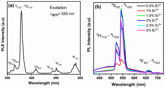 The excitation spectrum of the 550 nm emission band (green) in 2.0 mol% Er3+–doped CaTiO3 films is depicted in Figure 5a. The seven bands with centers at 357, 365, 379, 408, 445, 451, and 491 nm correspond to the excited levels, namely, 2G7/2, 4G9/2, 4G11/2, 2G9/2, 4F3/2, 4F5/2, and 4F7/2, respectively. The most prominent peak at 379 nm aligns with the 4I15/2→4G11/2 transition. The excitation spectrum reveals various pathways to obtain green luminescence from the CaTiO3 films. CaTiO3: Er3+ emits bright green emission when the films are excited by 390 nm laser light. The visible emission spectra for samples doped with 0.5, 1.0, 1.5, 2.0, 2.5, and 3.0 mol% Er3+ are presented in Figure 5b. The two prominent green bands in the spectral ranges of 522–535 and 537–560 nm align with the 2H11/2→4I15/2 and 4S3/2→4I15/2 transitions, respectively. The fainter red band in the 650–675 nm region aligns with the 4F9/2→4I15/2 transition [30].