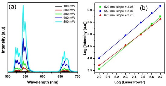 (a) UC emission spectra of the 2% Er3+ sample with different power density. (b) The log–log plots of red and green emission intensity as a function of the excitation laser power.