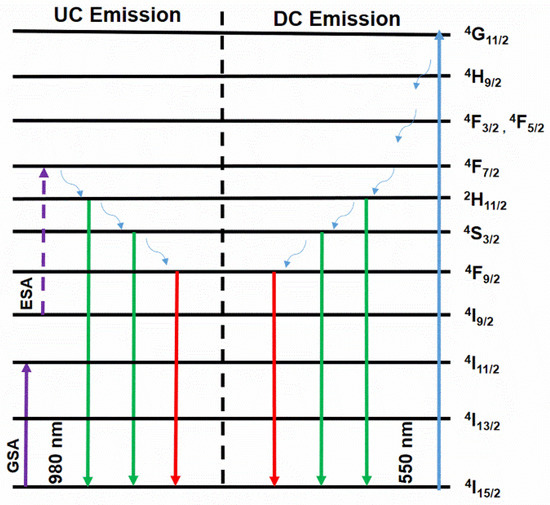 Figure 7 shows the system’s energy level diagram to understand the phosphor’s dual-mode green emission behavior. Several steps are proposed for selectively enhancing green UC emission of CaTiO3: Er3+ phosphors [9,32].