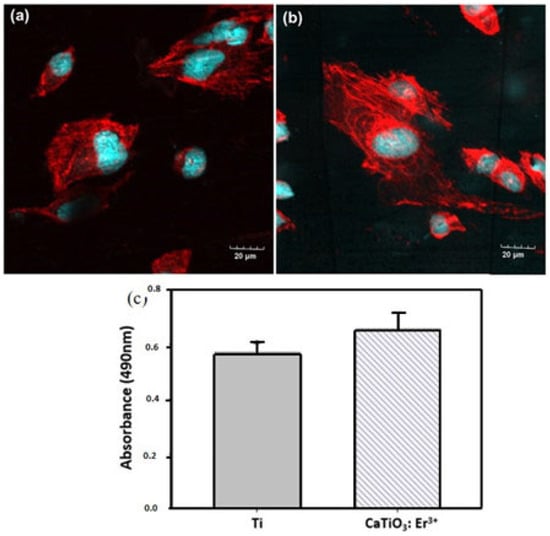 An MTS assay was employed to further assess the biocompatibility of the materials with the cell proliferation of the Ti and CaTiO3: Er3+ films. The rate of proliferation was measured after culturing up to 72 h, using MTS for mitochondrial reduction. This assay is based on the ability of metabolically active cells to reduce a tetrazolium-based compound, MTS, to a purple formazan product. The quantity of formazan product is directly proportional to the number of living cells in the culture. This assay is a widely recognized tool for evaluating a material’s suitability for biological applications [33]. Figure 9c shows cell proliferation on the Ti and the CaTiO3: Er3+ films. The rate of cell proliferation on the CaTiO3: Er3+ films was significantly higher than that of the Ti substrate. This suggests that the CaTiO3: Er3+ films supported the proliferation and growth of BHK cells without inducing any cytotoxic effects.