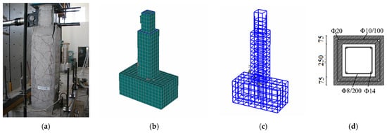 (a) RC-jacketed column tested in lab [14], (b,c) numerical models for concrete and for reinforcement, and (d) cross-section of strengthened column (dimensions in mm).