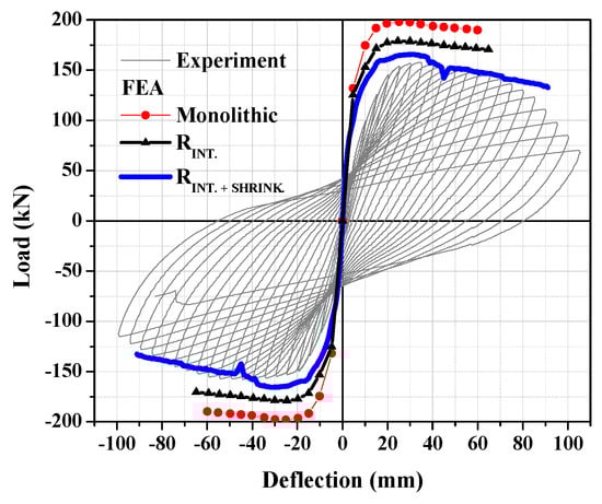To consider the effect of the jacket’s concrete shrinkage, a strain equal to 400 microstrains was also applied to the elements of the jacket, and in this numerical model, interface elements between the old and the new concrete were used with friction and cohesion coefficients equal to 1.0 and 0.0 MPa (specimen: RINT.+SHRINK.). The numerical results of these three assumptions together with the respective experimental results are presented in Figure 2.