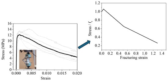 The stress–strain results for all of the examined specimens together with the averages are illustrated in Figure 4. ATENA version 5 FEA software [47] has been used for numerical simulations. The characteristics of the UHPFRC were determined from the compressive and tensile test results. The modulus of elasticity was taken as equal to 57.5 GPa and a compressive strength value of 164 MPa was used. The constitutive model for tension has been derived from the direct tensile test results and it consists of a linear part up to the tensile strength, which was calculated to be equal to 11.5 MPa, followed by a tri-linear part, as described in Figure 4. The fracturing strain values have been calculated considering the characteristic element size equal to 2 mm [35].