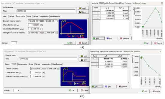 The characteristics of the material model used to simulate UHPFRC under compression and tension are illustrated in Figure 5a,b, respectively.
