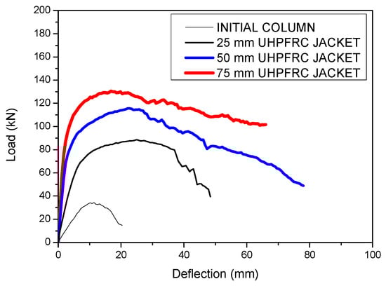 The results of Figure 10 indicate that there is a significant effect of the thickness of the UHPFRC jacket on strength enhancement. An increment in the range of 2.6–3.8 times was observed for UHPFRC thicknesses of 25–75 mm.