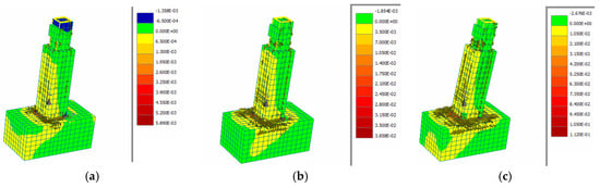 The crack propagation and the strain distribution along the height of the column for the 75 mm UHPFRC jacket with 5 mm, 20 mm and 60 mm horizontal displacement at the top of the column are illustrated in Figure 9. These results show significant strain increments and subsequent crack development for 20 mm and 60 mm displacement, as expected.