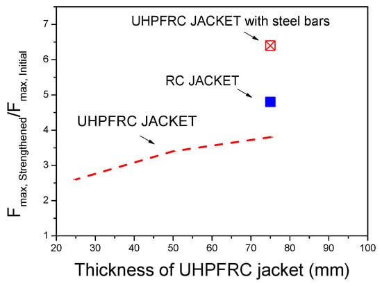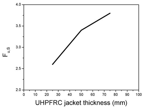 The results of Figure 8 show that the thickness of UHPFRC significantly affects the results, and as the thickness is increased, the stiffness and the ultimate load capacity are increased, as expected. The increment in the strength with the thickness of the UHPFRC jacket has been quantified using the Fu,S ratio, which represents the ratio of the ultimate load of the strengthened columns over the respective results of the initial specimen (i.e., ). The results of Fu,S for different values of thickness of the UHPFRC jacket are presented in Figure 10 [46].