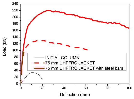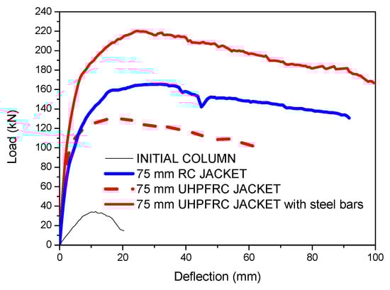 In this section, a critical evaluation of the results of the jacketed columns with conventional RC jackets, UHPFRC jackets and UHPFRC jackets with additional steel bars is presented. In all of the examined cases, a 75 mm thick jacket was used and a shrinkage strain equal to 400 microstrains was applied to the elements of the jacket. The load deflection results for all of these cases together with the results of the initial column are presented in Figure 15.