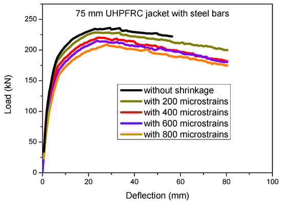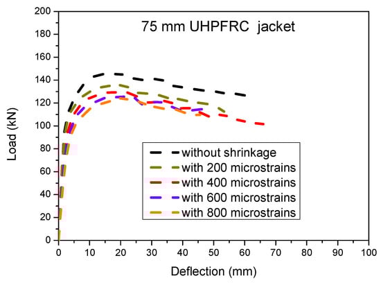 The effect of the UHPFRC jacket’s shrinkage is presented in this section. A parametric study has been conducted for the 75 mm thick UHPFC jacket with different values of concrete shrinkage. More specifically, shrinkage strain values of 200, 400, 600 and 800 microstrains were applied to the UHPFRC jacket and the numerical analysis results are presented in Figure 12 [46].