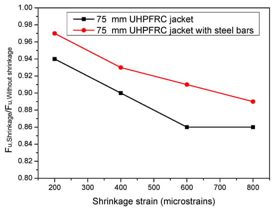 The results of Figure 14 show that in case of the 75 mm thick UHPFRC jacket without steel bars, a reduction in the ultimate load of almost 15% was observed for shrinkage strain, equal to 800 microstrains. The detrimental effect of concrete shrinkage is limited by the presence of the steel bars of the jackets, as in the case of the jacketed column with the 75 mm thick UHPFRC jacket with additional steel bars, higher values of the ratio Fu,Shrinkage/Fu,Without shrinkage were derived compared to the respective values of the jacketed column with the 75 mm UHPFRC jacket without steel bars.