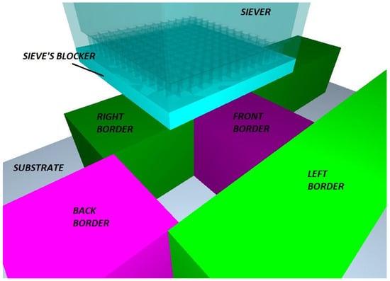 The powder sieving simulation features seven (7) bodies, namely the deposition plate, the front, back, left and right border (which define the area in which the sieved powder drops), the sieve (see Table 2 for mesh specs) and the sieve’s blocker (i.e., a plate that blocks the bottom of the sieve). The borders create a square 1 mm/side sample area. The height of the border plates is also equal to 1 mm, while the thickness of the blocker plate is equal to 100 μm (see Figure 1). The model features natural gravity and Schiller–Naumann drag model (see Table 1). All the physical bodies are made of stainless steel 304.