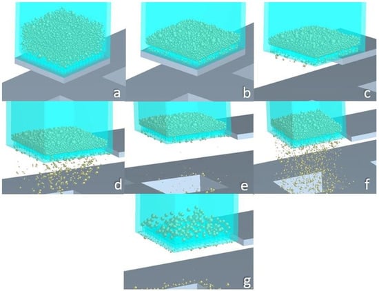 At the beginning moment of the simulation, all particles are created simultaneously by populating the powder factory cuboid (see Figure 2a) in such a way that inter-particle physical contact is avoided until no other particles can fit into the said virtual body. Then, they free-fall inside the sieve, while the bottom of the sieve remains sealed via the blocking plate. The particles partially occupy the sieve’s ducts, eventually clogging them up (see Figure 2b). When the particles practically become motionless (“frozen” particles), the blocking plate is removed, enabling the particles to fall onto the substrate (see Figure 2c–e). Then, the sieve begins vibrating vertically (Figure 2f) with an amplitude and frequency defined by the Taguchi DoE (see Section 3.1). The simulation is over when particle segregation is complete (see Figure 2g), i.e., when the only particles remaining in the sieve have a size larger than the sieve’s aperture.