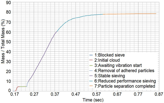 The total mass of the particles that have passed through the sieve over time and the particle size distribution of the particles that remain in the sieve over time are extracted. Specific quality criteria for the Taguchi DoE can be defined that use these data. Section 2.3 covers these criteria.