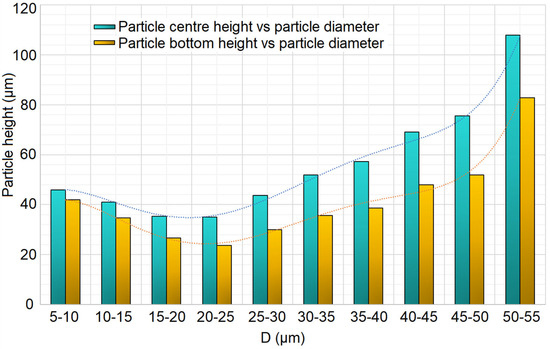 Furthermore, when sieving passes beyond the stable phase and into Stage 6 and even Stage 7, the mass flow drastically decreases, while the average size of the deposited particles increases. As a result, at the lowest sections of the layer, the smallest and medium-sized particles are located, while at the highest sections of the layer, the large particles become prevalent, see Figure 4. This shows the average height of the center of the particles in the sieving-produced layer for different particle diameter classes. The larger the particles, the higher their position in the layer, both by particle’s center and particle’s bottom evaluation. The plot refers to Trial #1 from the sieving Taguchi DoE (see Table 3).