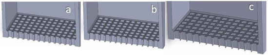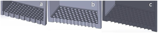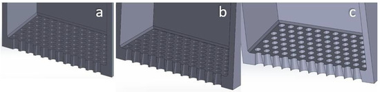 Figure 5. Section cut view of square-aperture sieves with different taper angle: (a) 1°; (b) 4°; (c) 7°.
