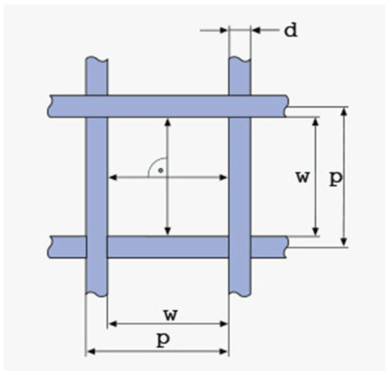 - Sieve ducts’ taper angle, θtap (degrees), examined at three levels: 1°, 4°, 7°. The sieve is open at the top, rectangular, with square apertures. The side of the sieve is 1 mm, and its height is 2 mm (referring to sieve interior dimensions; sieve volume capacity is 2 mm3). The thickness of the sieve is 100 μm and kept stable for all the simulations. The ducts have an inverted taper shape; hence the aperture diverges while moving downwards (see Figure 5). This variable aims to examine whether the adhesive forces and duct clogging differ with various taper values. The values chosen were in agreement with industrial manufacturing standards [30], while ensuring that the inverted taper-shaped ducts would not intersect each other throughout the metal sheet’s thickness. The sieving plate is designed by the process of electroforming a thin, 100 μm thick metal sheet to create inverted taper-shaped apertures throughout the sheet. The geometry of the square mesh is described in Figure 6. The figure refers to woven wire mesh, but the same terminology and definitions apply to a sheet form mesh as well [31]. The sieve used in the simulations (see Figure 6) is designed to be a 325 mesh (325 lines/inch) with an aperture width of 50 μm (w = 50 μm) and a mesh pitch of 78.2 μm (p = 78.2 μm). This means that the distance between two consecutive apertures is equal to d = p − w ⇒ d = 28.2 μm. The calculations are in accordance with the specifications provided in [30], as can be seen in Table 2. There is also the possibility of having hexagonal (coxcomb) or circular (round) apertures. Possible differences in their behavior will be examined with regard to the Taguchi-defined optimum levels for the square-aperture sieve, for time reasons, since sieving simulations are quite time-costly.