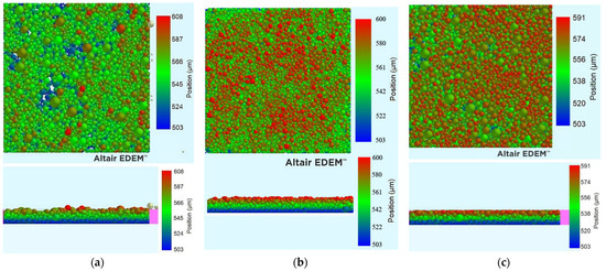 The realistic behavior of the powder model was ensured via cross-check between simulations and experimental measurements of the angle of repose and the angle of avalanche, as can be seen in [18]. The software used for the simulations was EDEMTM (version 2022.2), kindly provided by AltairTM (Troy, MI 48083, USA).