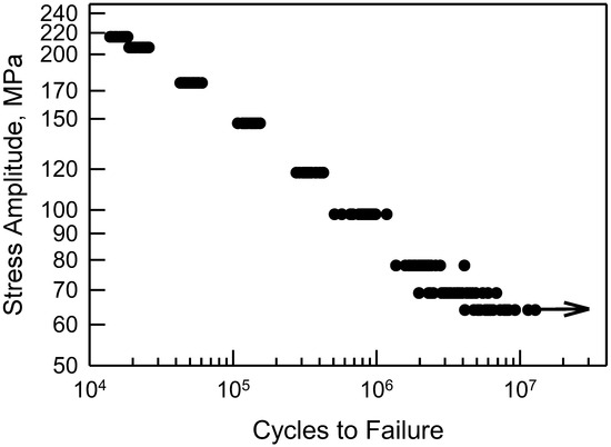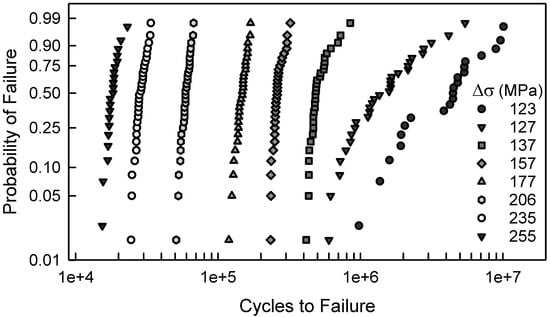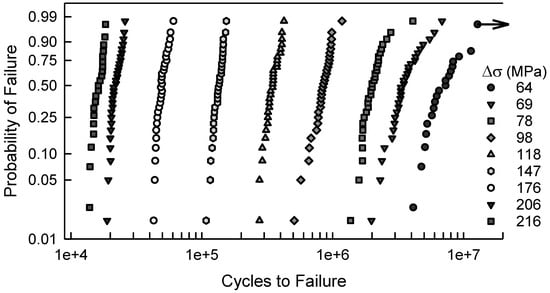 For the notched specimens, the fatigue failure data are shown in Figure 3. There are similarities to the data in Figure 1. For the six largest values of Δσ, a two-parameter Weibull cdf is acceptable; however, for the other three conditions, it would not be acceptable. The scatter in the data coupled with the curvature makes a statistical fit more challenging. Furthermore, when Δσ is 64 MPa, there are three identical data that were censored, as indicated by the arrow in Figure 3. Thus, the censoring has a significant effect for fitting a cdf for these data. Again, empirically selecting a suitable cdf is nontrivial, and it appears that more involved analysis may be needed. Likewise, Figure 4 is the S-N diagram for specimens with a notch. When Δσ exceeds 100 MPa, the scatter is similar, but for less than 100 MPa, the scatter increases as Δσ decreases. Again, the arrow indicates that there are three similar data that were censored.