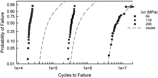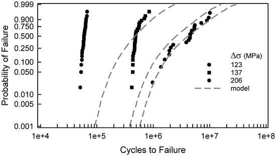 Figure 5 shows the fatigue failure data for Δσ equal to 123, 137, and 206 MPa, which are also in Figure 1. The dashed lines are the simulated model cdfs developed above, which is entirely independent of the fatigue lives. The model is quite good when Δσ is 123 MPa. When Δσ is 137 or 206, the model is not suitable at all. In fact, the model and the data have a maximum deviation of almost an order of magnitude when Δσ is 206 MPa. For the other values of Δσ shown in Figure 1, the model is likewise not appropriate. Consequently, an alternative approach is required.