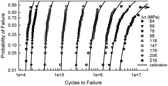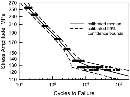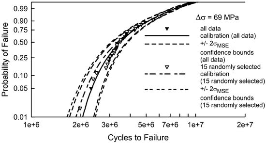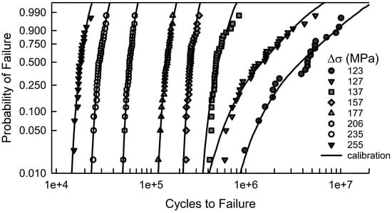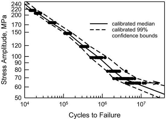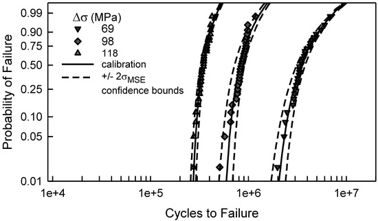 Before continuing, recall that because of the censored data when Δσ equals 64 MPa, the sample average and standard deviation were estimated by using the Kaplan–Meier methodology [12]. They are recorded in Table 2. These estimates were used in the calibration; see Equation (12). The inference is that the proposed calibration approach is also suitable when censored data are part of the results. In fact, the methodology requires no modification as long as the sample average and standard deviation can be suitably estimated.