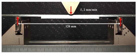 To ensure relevance to real-world aerospace applications, three-point bending loading was selected to study PTTR bondline failure progression under controlled quasi-static conditions. While real-world disbonding often occurs under fatigue loading, the failure progression is expected to be similar. This approach helps characterize initial responses and failure mechanisms, with further testing under fatigue and additional loading conditions needed for full validation and optimization. Under monotonic three-point bending (Figure 2), the skin–stringer bondline experiences mixed-mode loading, where shear load or mode II is initiated due to shear deformation at the edge of the joint, and opening mode I bridging force is created due to peel stresses at the free-edge [33]. The fixed bottom roller was placed at 120 mm with the stringer facing down, and the top roller applied a displacement rate of 2 mm/min. To accurately represent the skin–stringer interface disbond/crack propagation, the GOM 3D digital image correlation (DIC) setup was used.