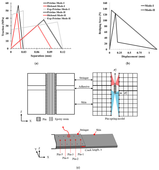 The single-pin model is shown in Figure 3. A 3D non-linear spring element (CONN3D2) was used to simulate the bridging effect of the pins. At the pin mounting location, a through hole was modeled across the skin and stringer (as shown in Figure 3c) with two reference points: one coupled to the nodes at the skin side hole and another point coupled to the nodes at the stringer side hole. These reference points act as contact points for the spring element to simulate the pin bridging effect, using a force–separation constitutive law. The 3D spring element coupled with skin–stringer side node holes captures the effect of the hole being filled with resin and pin. Depending on skin–stringer–pin samples’ dimension configuration and mode I/mode II loading ratio, the pin failure mode can change. Furthermore, pin failure is highly dependent on the AR for PTTR [27], resulting in increased interlaminar strength as AR increases for mode I. Based on the current stringer thickness and pin diameter, AR = 2.42, pin pullout behavior was assumed; thus, a trilinear force–separation bridging law was considered, as shown in Figure 3b. This bridging law captured three phases of pin pullout. First, an elastic response was considered where a perfect bond was assumed between the pin, resin, and laminate hole. In the second phase, an instantaneous drop in the bridging force occurs due to the pin disbonding as a result of interface failure between the pin–epoxy or epoxy–laminate hole. In the last phase, through-thickness pin slip-outs under interfacial friction lead to a complete pin pullout.