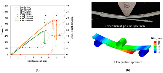 Skin–stringer CZM validation results: (a) force-displacement curve and crack length comparison between experimental and FE model for pristine and initial disbond specimens. (b) Post adhesive disbonding for pristine specimen.