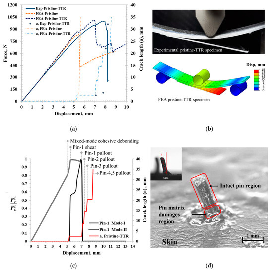 (a) Force–displacement curve and crack length comparison between experimental and FE model for the pristine-TTR specimen. (b) Post adhesive disbonding for pristine-TTR specimen. (c) Pin failure analysis using FE model: spring reaction force fraction vs. displacement for pristine-TTR under bending. (d) Post-pin-failure microscopy analysis.