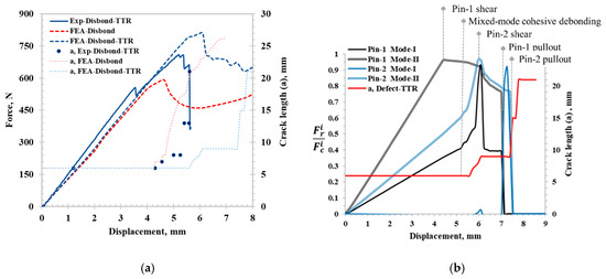 (a) Force–displacement curve and crack length comparison between experimental and FE model for the disbond-TTR specimen. (b) Pin failure analysis using FE model: spring reaction force fraction vs. displacement for disbond-TTR under bending.