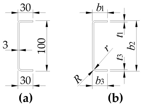 i = 1, 2, 3, …, 8). The theoretical nominal dimensions (following the contour of the section) of the C100 × 30 × 3 channels used and the designations of the dimensions measured on each C-section are shown in